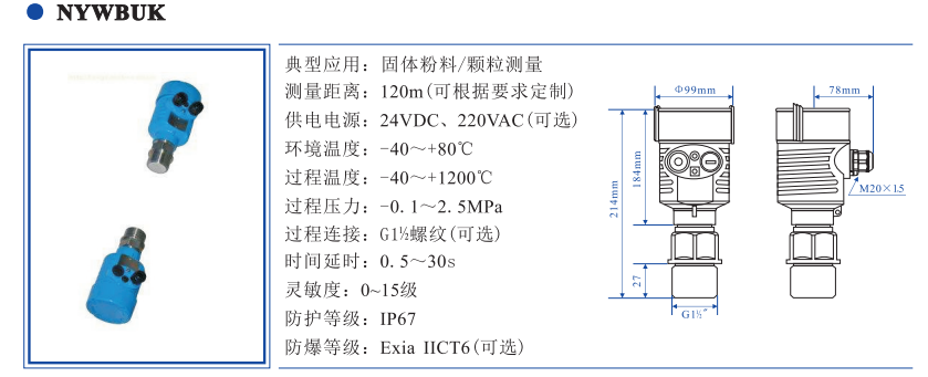 NYWBUK系列微波物位开关是一款基于极窄脉冲微波探测技术的固体料位检测开关。该产品采用成对发射-接收设计,通过微波信号的通断状态精准检测料位位置,适用于粉料、颗粒等因体介质的堵料或空仓报警具有抗干扰性强、稳定性高、耐极端工况等特点,广泛应用于水泥、冶金、粮食仓储等行业。