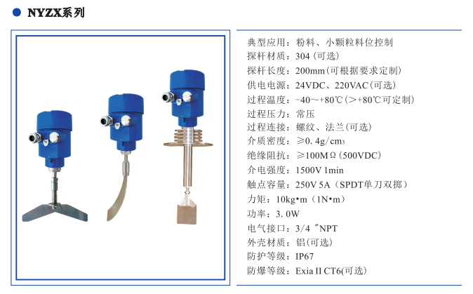 NYZX系列阻旋式料位开关用于检测固态物料(粉装、颗粒)物位高度的现场控制设备,广泛用于饲料、食品、制药、化工、塑料、建筑、肥料等行业。